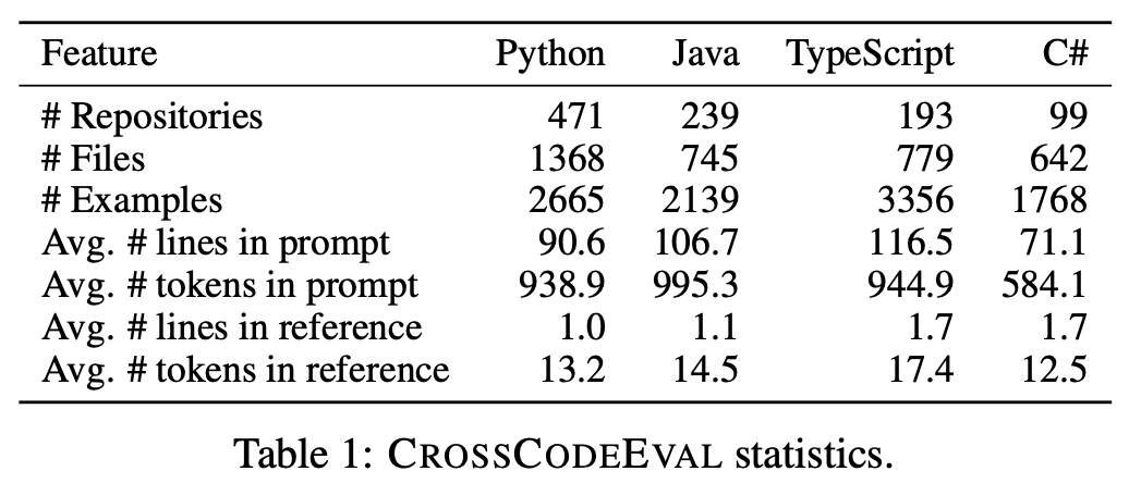 Statistics: We present the statistics of CrossCodeEval. We use the StarCoder tokenizer to compute the number of tokens.
