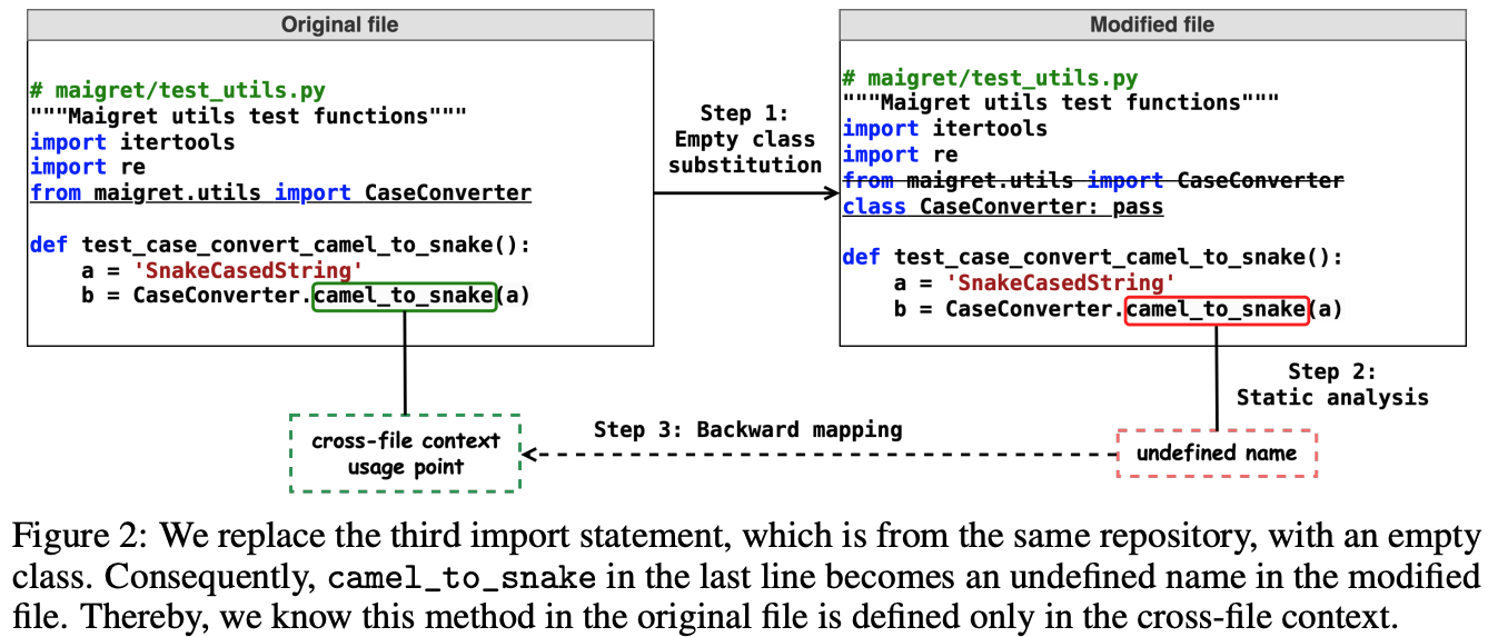 We collect permissively-licensed repositories from GitHub across four programming languages: Python, Java, TypeScript, and C#. We leverage a static-analysis-based approach to identify code fragments that require cross-file context automatically. Specifically, we replace import statements with empty classes, and run static analysis to identify undefined names which locate cross-file usages.