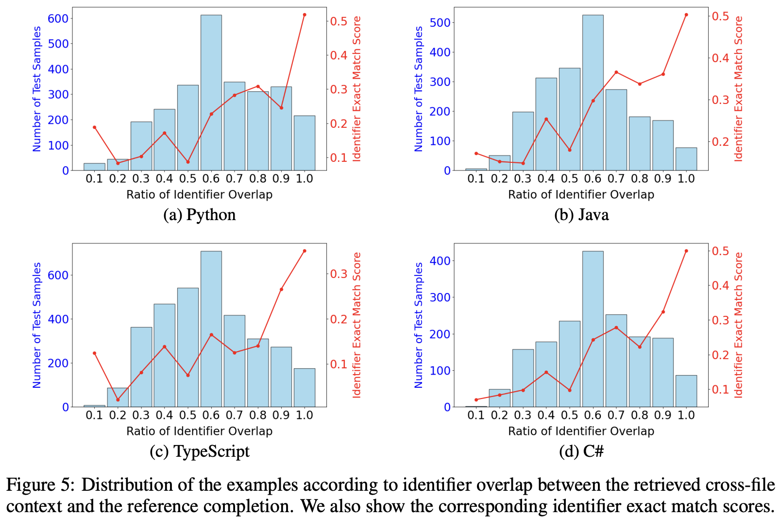 Identifiers are a significant part of programming language constructs that cover API mentions in source code. We find that an increased ratio of identifier overlap between the retrieved context and the reference solution generally results in higher performance, demonstrating a positive correlation. This calls for an investigation into retrieval techniques, with a particular emphasis on key terms like identifiers for cross-file context retrieval.