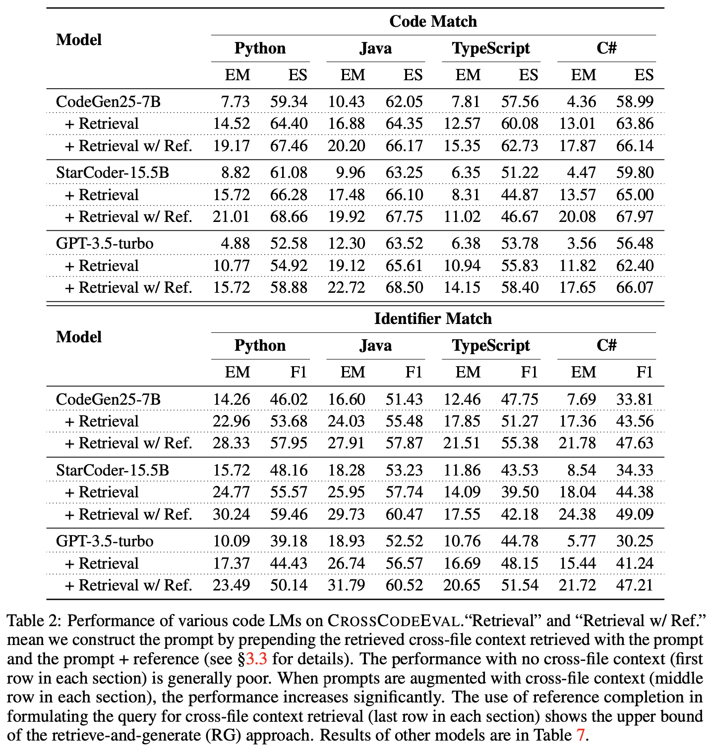 We benchmark CrossCodeEval with popular public and proprietary large language models: CodeGen, SantaCoder, StarCoder, and GPT-3.5-turbo. We prompt the language models in the zero-shot manner under the following three settings with different levels of cross file context.