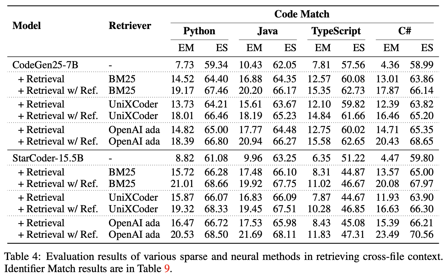Given the strong dependency that the correct prediction requires an accurate retrieval of relevant cross-file context, we propose to use CrossCodeEval as a code retrieval benchmark. We find that OpenAI's ada embedding generally performs the best, but its downstream generation accuracy is still suboptimal (<20 EM), calling for future development of better code retriever.