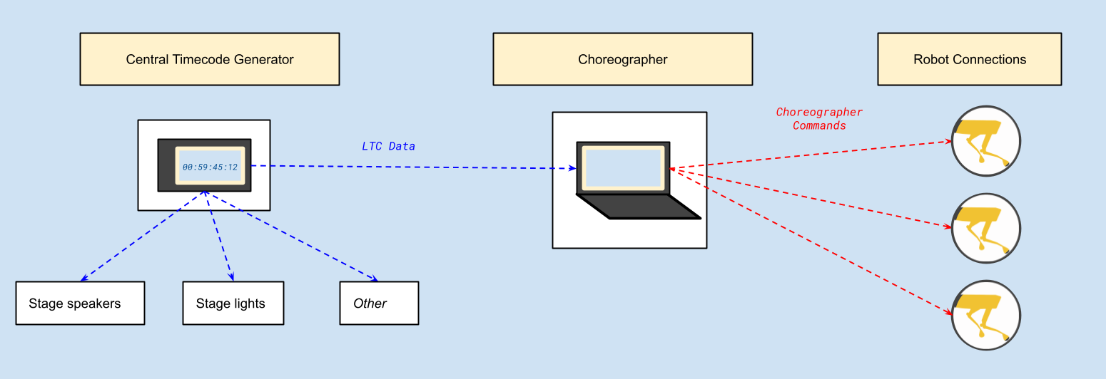 Choreographer can become a component of a larger stage system by receiving and parsing timecode cues from a central timecode source, and using this timecode input to determine when to start choreography sequences for its robot connections. All stage components (ex. audio, lights) including Choreographer connected to this central timecode generator share the same timing reference point, which means choreography sequences can be near perfectly synchronized to these other stage components without directly communicating with them.