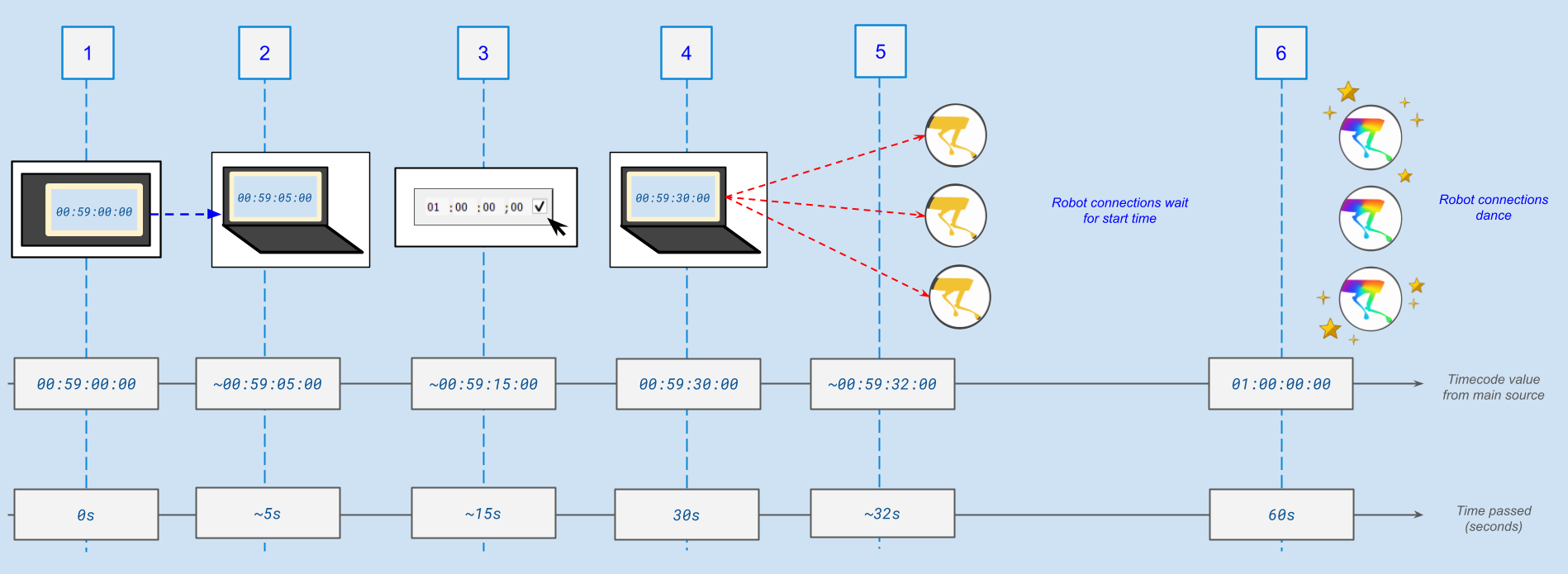 At the set start time, robots begin dancing. This is triggered by the robot countdown communicated by Choreographer at step 4, not by a live timecode signal.