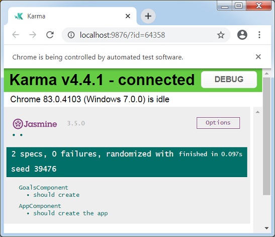 \>Node\>TutorialsPoint> ng test ... WARN: ''app-goals' is not a known element: 1. If 'app-goals' is an Angular component, then verify that it is part of this m odule. 2. If 'app-goals' is a Web Component then add 'CUSTOM_ELEMENTS_SCHEMA' to the '@ NgModule.schemas' of this component to suppress this message.' Chrome 83.0.4103 (Windows 7.0.0): Executed 1 of 2 SUCCESS (0 secs / 0.053 secs) ... Chrome 83.0.4103 (Windows 7.0.0): Executed 2 of 2 SUCCESS (0.097 secs / 0.073 se cs) TOTAL: 2 SUCCESS