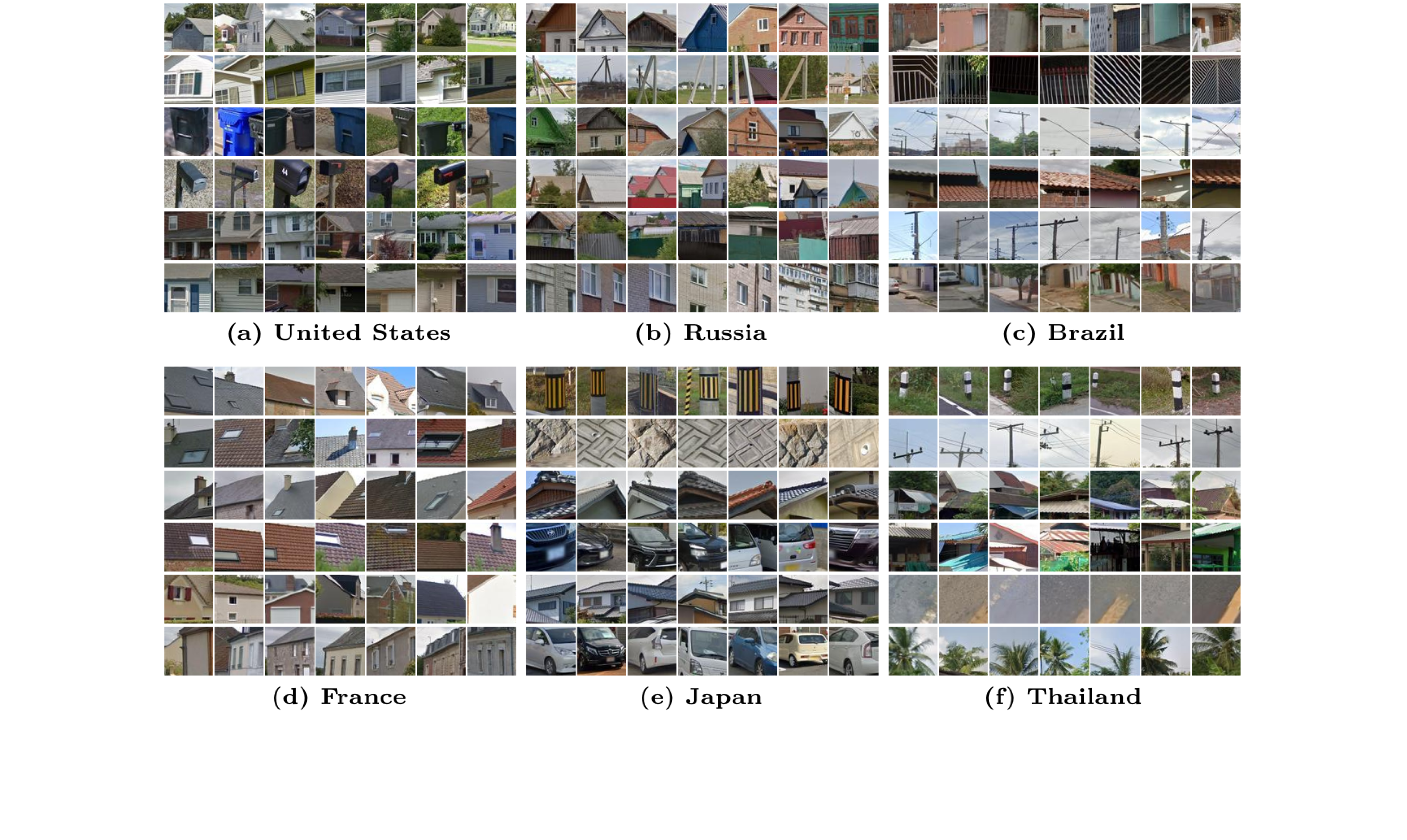 Clustering typical translations of elements across countries. Ranking translated visual elements according to $\mathbf{T}$ and clustering the translated sequences results in groups of elements with similar variations. We show elements from 6 selected clusters out of 32. The source image for each sequence is highlighted in red.