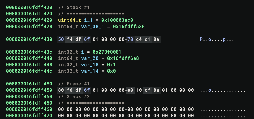 the user), and the start function in the dyld module comes from the LLDB backend, which can read symbols from other