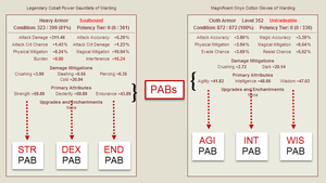 - Экипировка может иметь специальный показатель, именуемые PAB (от англ. Primary Attribute Bonus), которые повышают определённые атрибуты персонажа.