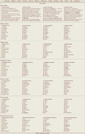 Similar to the gallery toplist, this list is for the cumulative total activity of all of a user's galleries. This list is much more competitive since users need to upload many galleries that continually receive visits. Users can see what kind of activity their galleries are cumulatively receiving on their My Stats page.