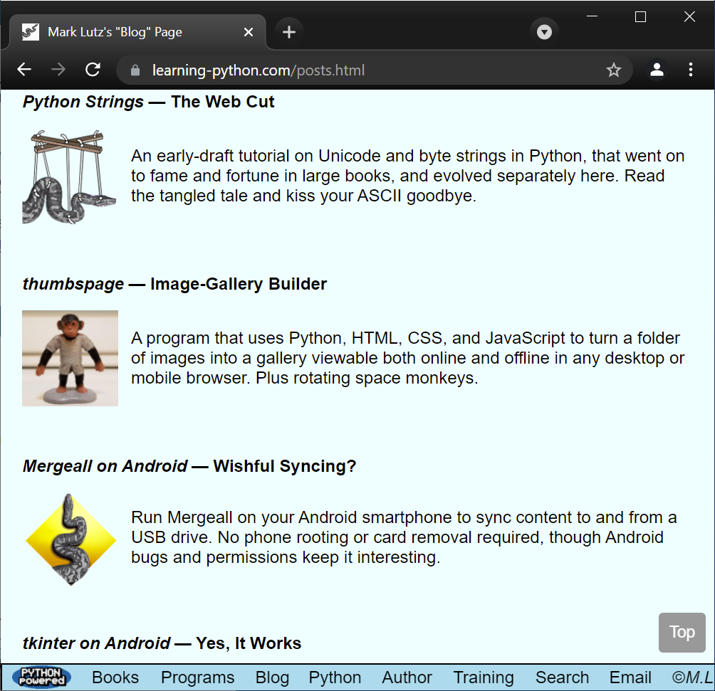 Subtle thing: the preceding note's new Top buttons may slightly overlap page-bottom toolbars like this when viewed with most desktop browsers in very small and narrow PC windows, because these browsers reserve extra space for a scrollbar. This can happen on Windows, Linux, and macOS, though not on macOS when using a touchpad and the General preferences' automatic scrollbar-hiding default (which acts much like a mobile device).