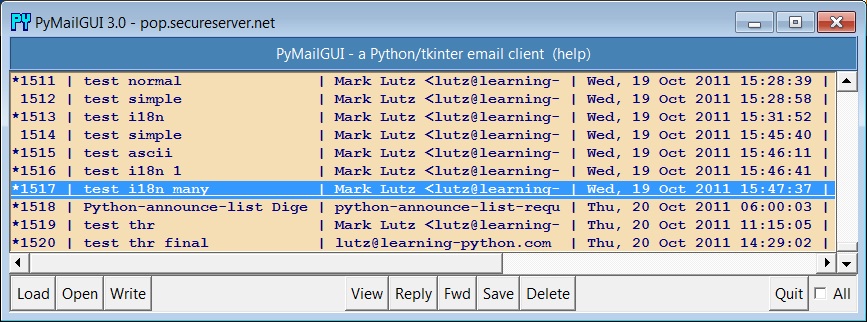 From the semi-related-topics department: additional PyMailGUI changes to support POP over SSL, SMTP over SSL/TLS, and POP servers that limit logins by time (thereby perhaps requiring a single persistent login instead of one login per transaction) are in progress, but are also suggested exercise. Accounts on outlook.com are one motivation for some of these mods. The first two (SSL/TLS) are now supported in Python's libs, but not yet in PyMailGUI; see Python manuals for usage details, and this related note on this page.