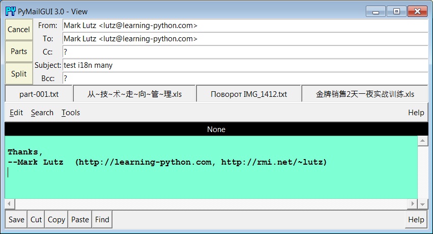 [Sep-15-13] Per the description elsewhere on this page, a Python 3.3 standard library change broke some email address displays of non-ASCII names in PyMailGUI, the largest example in the book. In short, the Python 3.3 email package's formataddr utility function now applies a new automatic MIME encoding for names, which it did not in the past—a curious and undocumented incompatible change, which did not account for display-oriented use cases, and can break code that worked well under Pythons 3.0 through 3.2 (including some in this book). Luckily, this is fairly easy to repair.