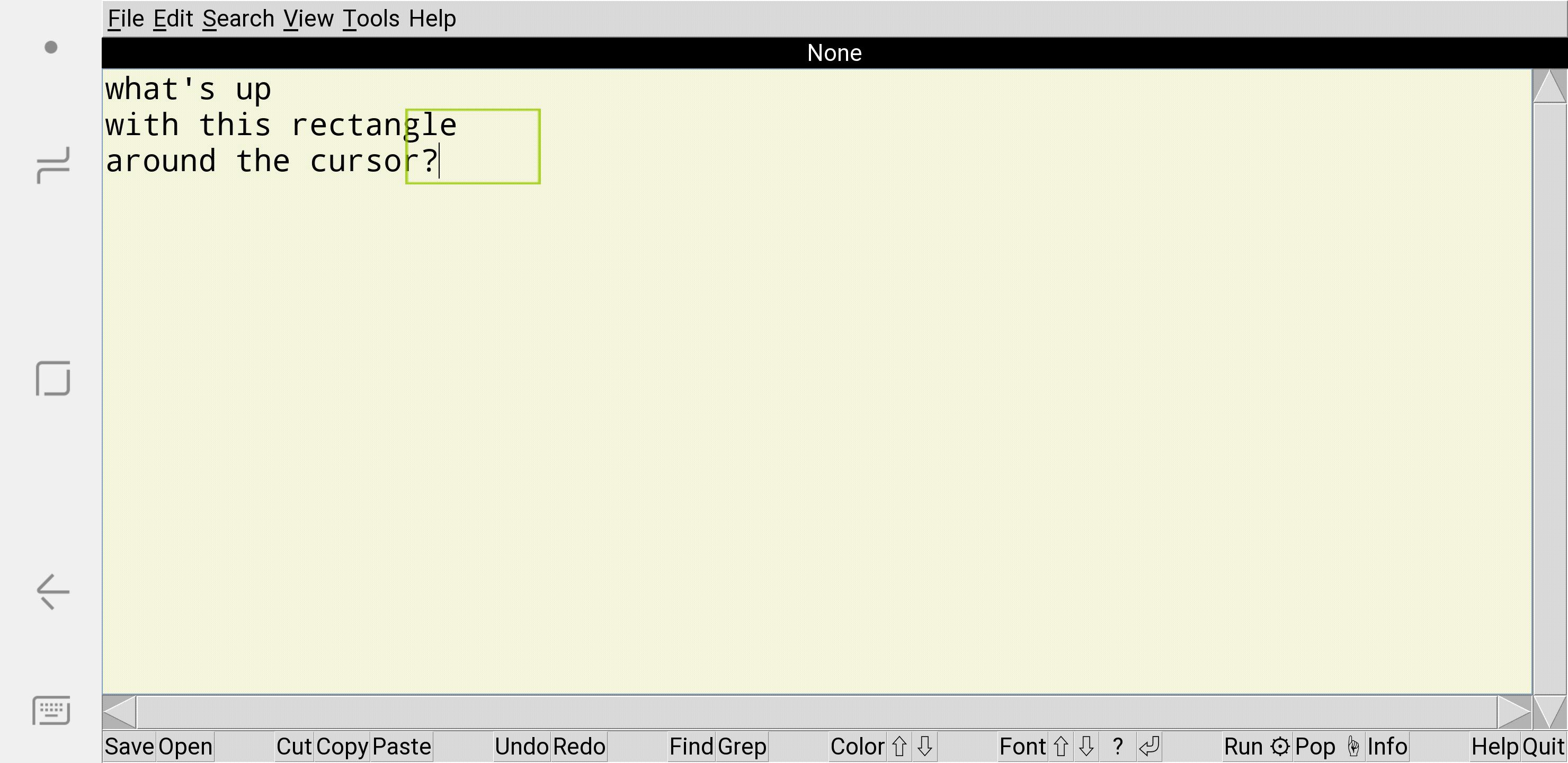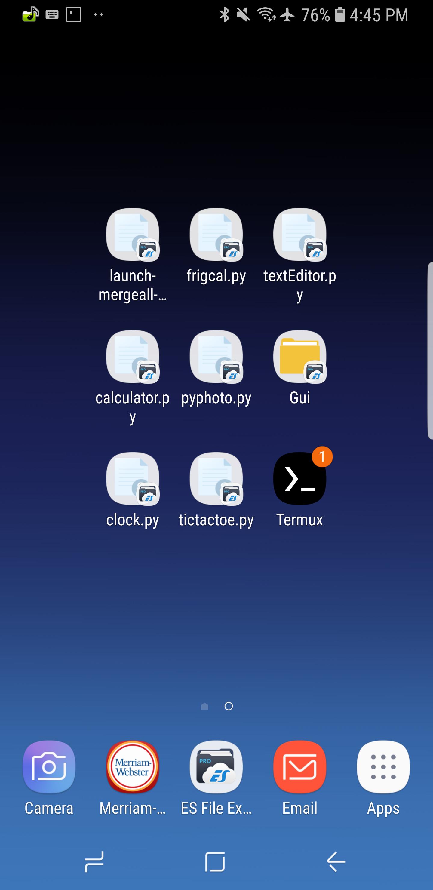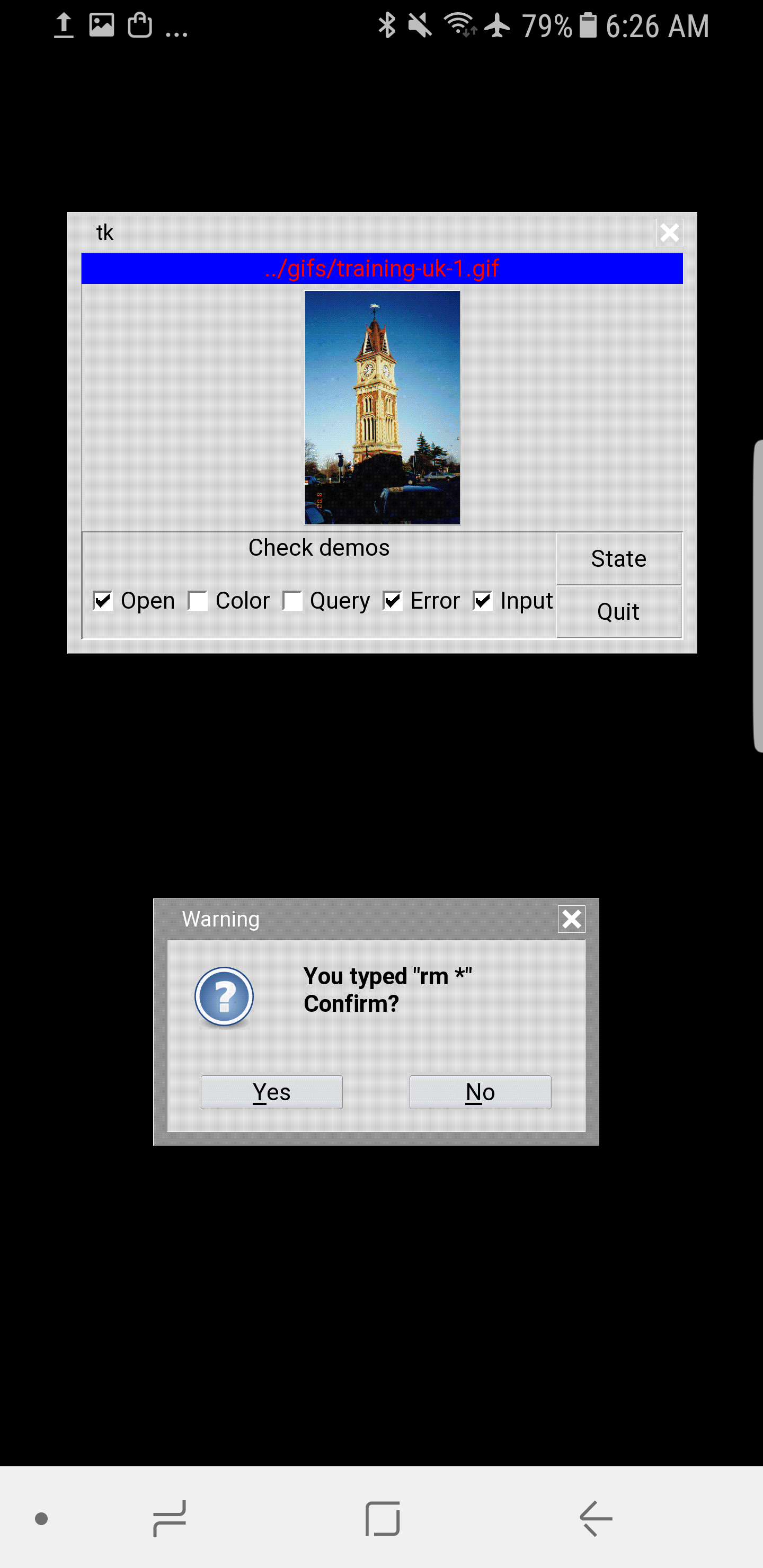 Please note: the programs described here are wholly dependent on five other systems—Android, vendor extensions, Python, Android Tk, and Pydroid 3—all of which regularly change their behavior for both better and worse. Undocumented changes in Pydroid 3, for example, recently forced patches here and here, and Android currently threatens a much broader sea change. It's difficult for documentation to remain current in this context and just as tough for programs to continue working as intended.