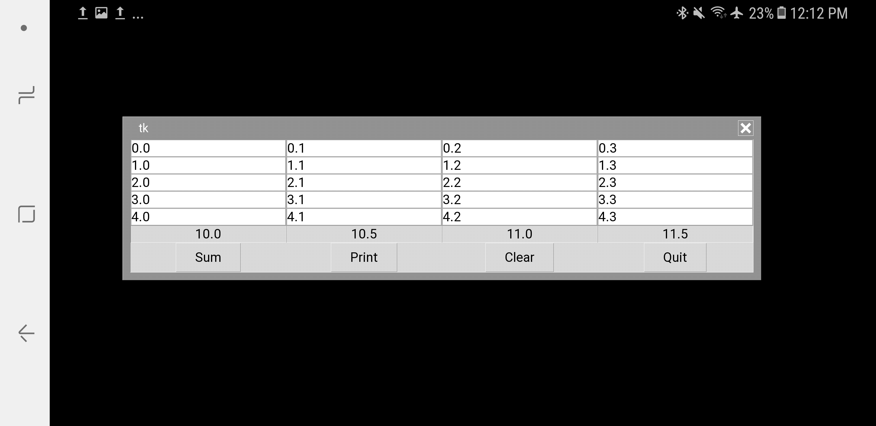 Keyboard backspace and enter/return keys were enabled by patches in April 2019 that work around an issue in Pydroid 3's tkinter, but shifted operator keys remain unusable on Android due to a bug in this tkinter, described further here. This is, however, a minor limitation for a redundant and less-functional usage mode: the "cmd" popup supports all key presses, including backspace and enter/return; using an on-screen keyboard for the main display requires tapping a "cmd" input field or opening an on-demand keyboard like Hacker's Keyboard (see its PyPhoto note above); and the GUI's calculator buttons are usually easier to use than a keyboard in any event.