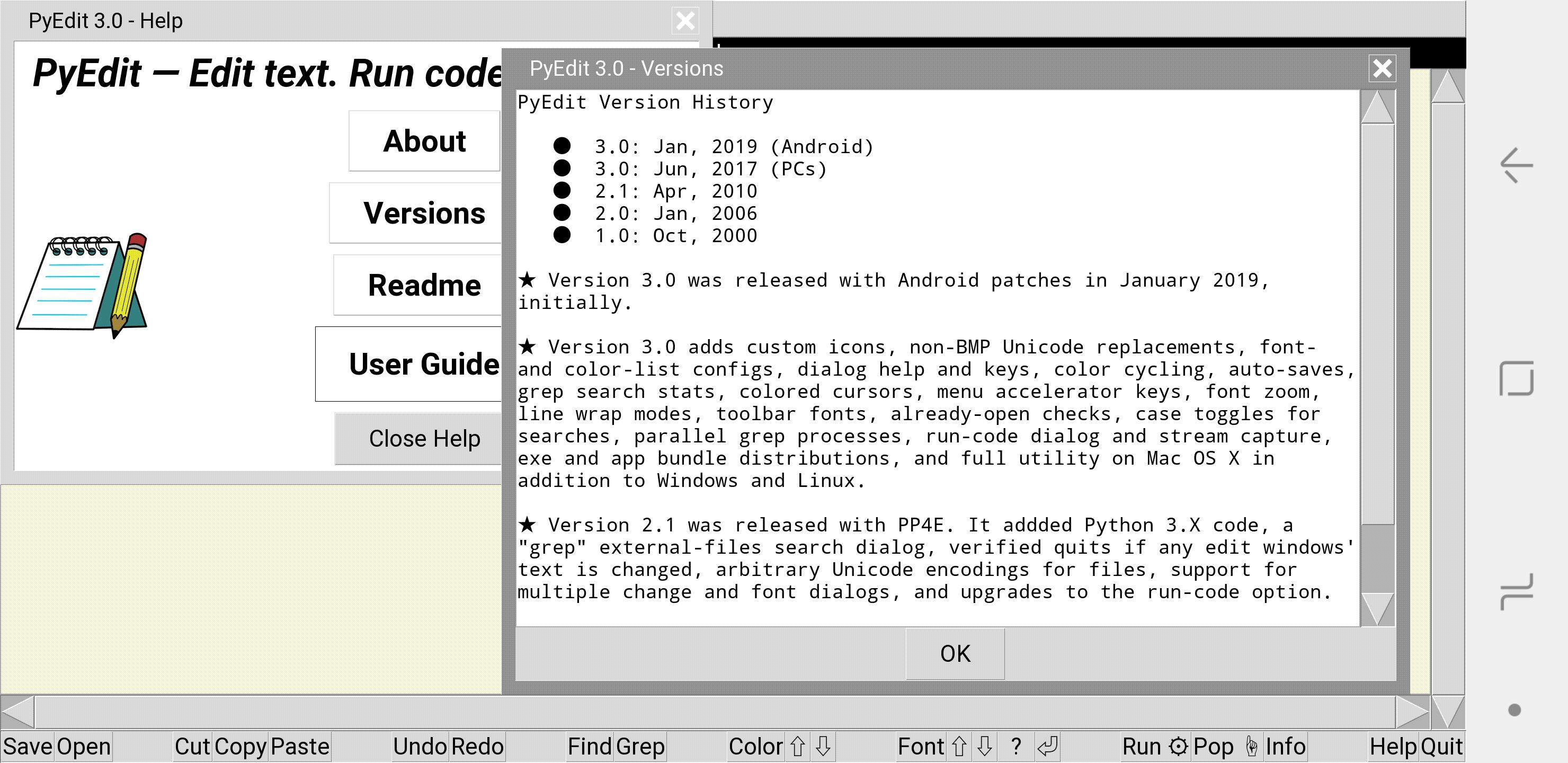 Findings here reflect versions 2.22 and 3.0 of Pydroid 3; 3.6 and 3.7 of Python; 7, 8, and 9 of Android (Nougat, Oreo, and Pie); and 8.6 of the Tk library wrapped by tkinter (in an Android port of unknown origin). Programs described here are currently known to work on all these systems, except where noted ahead. Per the notebox above, be sure to check facts here against these systems' current status if you're reading this in the future.
