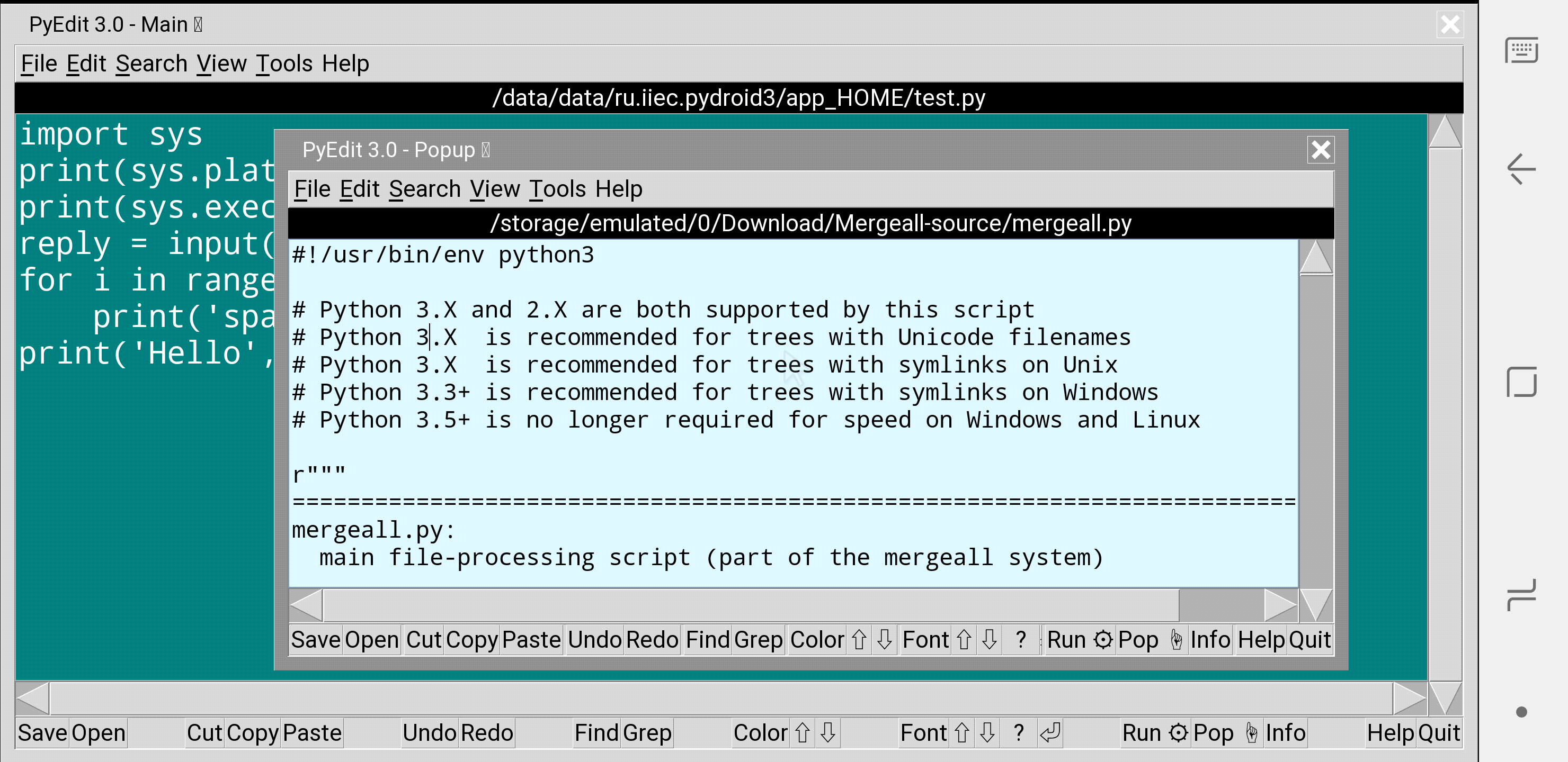 Because Mergeall's GUI has no persistent popup windows and its exit verification can be skipped, it may render and work best using Pydroid 3's tkinter fullscreen and maximized viewing modes, the latter of which automatically resizes for fit on rotations. Select these modes by turning the first "Tkinter" switch off and the second on in Pydroid 3's Settings ⇨ System dialog before running the GUI, and press your phone's back button twice to exit the GUI. Mergeall's GUI can be run in non-fullscreen and non-maximized viewing modes too (see the captures above), but they hold little usage advantage.