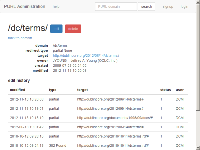 Every PURL has a page that shows information about the PURL including the revision history. There is a link to the edit page.