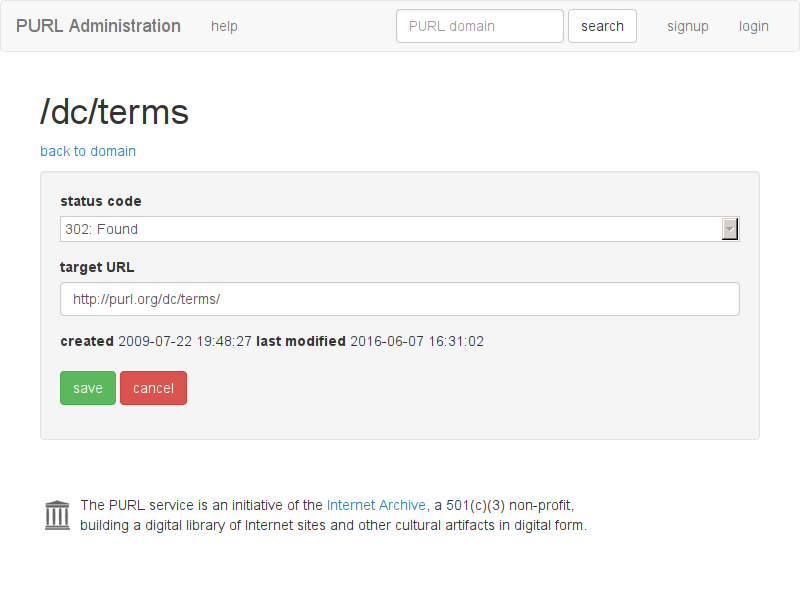 The PURL service is now administered by the Internet Archive. If you have any difficulty making changes to your PURLs please contact [email protected] for assistance.