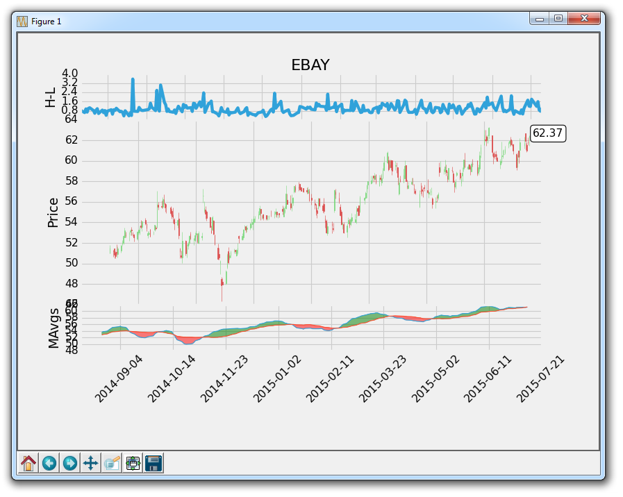 Now I think it would be a cool idea to add a custom fill to our moving averages. Moving averages are generally used to illustrate trends with prices. The idea is that you can have a fast moving average and a slow one. Generally, moving averages are used to "smooth" price. They will always "lag" price a bit, but the idea is to have varying speeds. The larger the moving average, the "slower" it is. So the idea is that, if the "faster" moving average crosses above the "slower" one, that price is trending up, and this is a good thing. If the fast MA crosses below the slow MA then this is a down trend and usually seen as bad. My idea is to fill between the fast and slow MA when trend is "up" a green color, and then do red when it is down. Here's how: