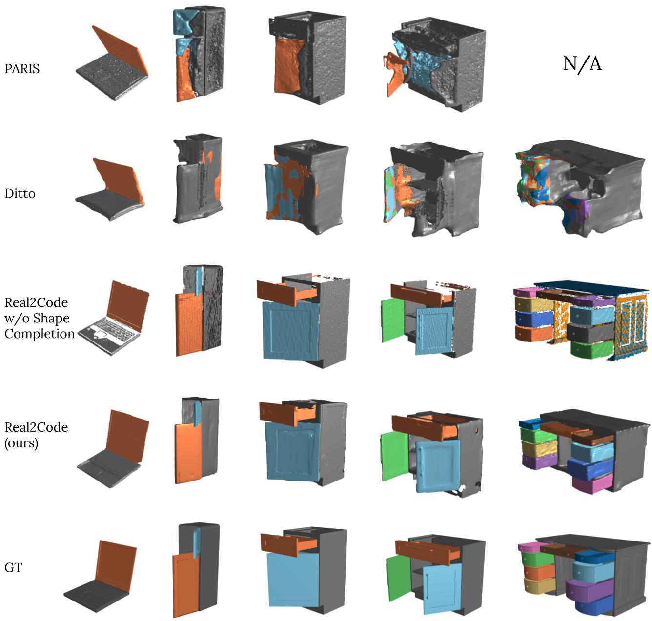 We evaluate on objects with a range of varying kinematic complexities, from a two-part laptop to a ten-part multidrawer table. Whereas all methods can handle the simpler laptop articulation, baseline methods struggle as the number of object parts increases, and Real2Code performs reconstruction much more accurately. PARIS runs out of memory and fails to run on the ten-part table (N/A).