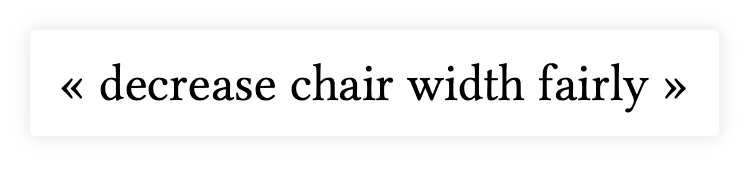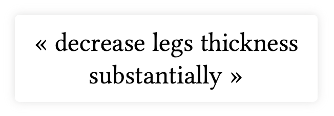 We also experiment with a more complex transformer-based diffusion model operating in the latent space of 3DS2VecSet, a global latent set representation. We show generated meshes following a variety of language-guided edits below, at every step of the diffusion process. Generated edits are of high quality, and enable fine-grained shape changes (e.g. decreasing legs thickness) as well as complex layout changes (e.g. adding a slatted backrest).