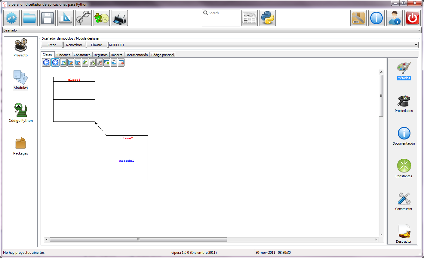 vipera is a combination of basic tools for the design of applications in the early stages of development, allowing the creation of modules (libraries) and definition of their basic characteristics, such as classes, functions, records, constants and import modules. The design of classes is done graphically, by means of a code similar to UML. It includes an inverse engineering option, that is, from Python scripts, classes and relationships are identified and represented graphically.