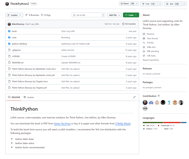 ThinkPython2 is the repository for the second edition of Allen Downey’s Think Python textbook, which teaches programming fundamentals in Python to beginners. The code includes all of the example programs, exercises, and supplementary files referenced in the book, allowing learners to run the examples, experiment, and extend them. The repository contains clean, well-commented Python scripts that are easy to follow and map directly to chapters of the text, covering topics like variables, control flow, functions, recursion, data structures (lists, dictionaries), classes and objects, file I/O, and algorithmic thinking. It also contains solutions or hints for many exercises so learners can check their work or explore alternative implementations. Because it’s educational, the repository emphasizes readability, clarity, and progressive learning rather than performance tuning or advanced constructs.