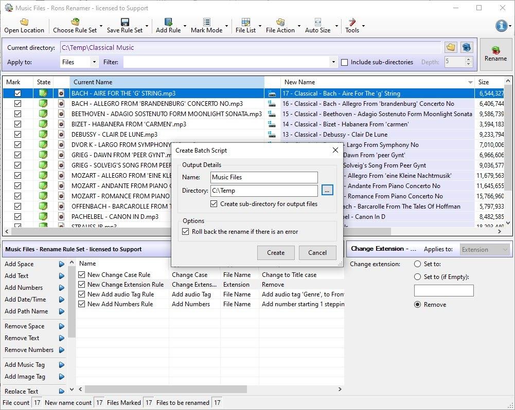 Rename many files, folders and subfolders in one go in a quick, safe and easy way with Rons Renamer. Renaming batches of files simultaneously allows folders to be kept clean, sorted and consistent. Ideal for keeping pictures or digital snapshots, music, movies, texts or any other type of files organized. 15 simple renaming rules can be combined into rulesets, and saved, allowing flexibility and fast operation. The rules contain both basic and advanced options.