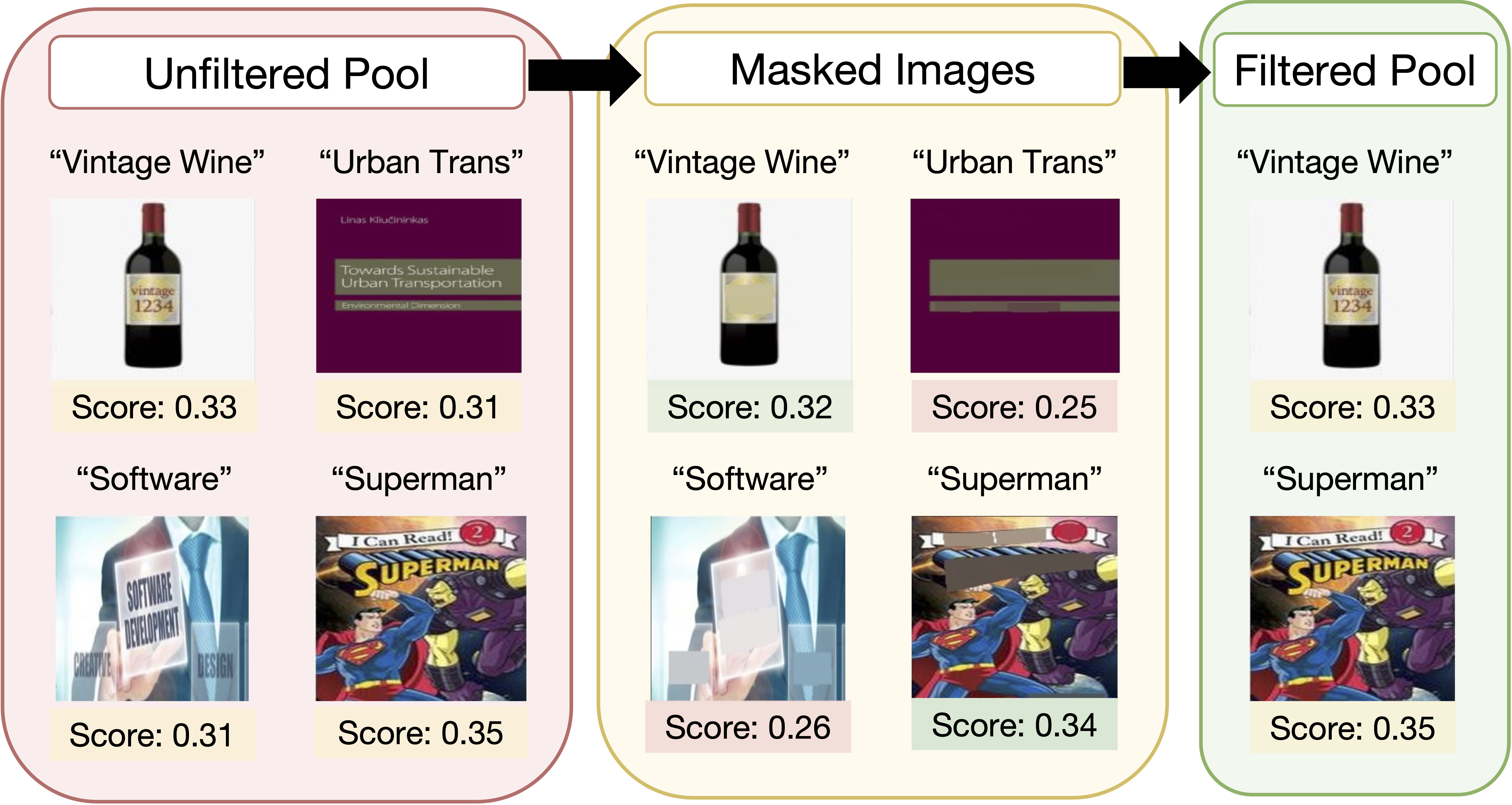 • 3. Re-scoring and Filtering: Finally, we retain only those images whose corresponding masked images have a high CLIP similarity score with the original caption i.e. have visual features correlated with the caption.