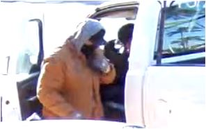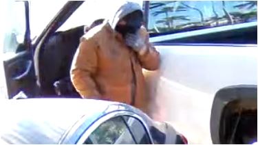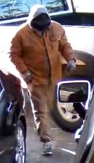 DESCRIPTION OF SUSPECT #1 – Unknown male, large build; wearing a black hat, orange hooded jacket, black face mask, gloves, tan cargo pants, gray shoes