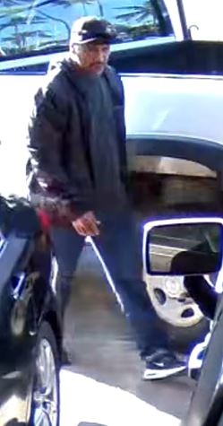 DESCRIPTION OF SUSPECT #2 – Unknown male, large build, black mustache, brown eyes; wearing a black hat, black sunglasses, black shirt, black jacket, blue jean pants, and black and white shoes